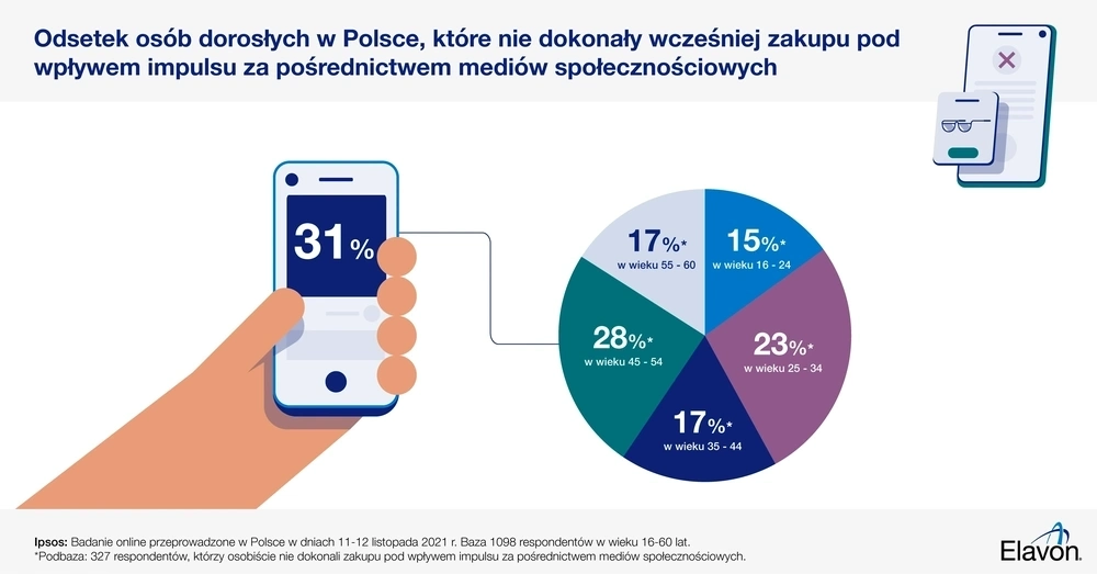 Prawie jedna trzecia (31%) dorosłych w Polsce twierdzi, że osobiście nie dokonała zakupu pod wpływem impulsu wywołanego przez media społecznościowe, a największy odsetek tych osób - ponad jedna czwarta (28%) - jest w wieku od 45 do 54 lat.