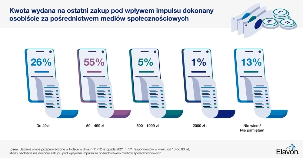 Spośród osób, które osobiście dokonały spontanicznego zakupu za pośrednictwem mediów społecznościowych, ponad jedna czwarta (26%) wydała do 49 zł, jednak największa część – ponad połowa (55%) – wydała na ten cel od 50 zł do 499 zł.