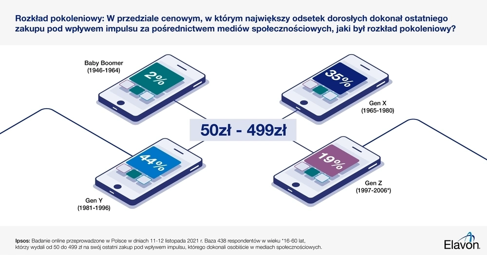 • Łączna baza respondentów obejmuje 1098 osób dorosłych, które wypełniły ankietę w dniach 11–12 listopada 2021 r., oraz 771 osób, które osobiście dokonały zakupu pod wpływem impulsu za pośrednictwem mediów społecznościowych, 327 osób, które nie dokonały osobiście zakupu pod wpływem impulsu za pośrednictwem mediów społecznościowych oraz 417 osób, które wydały 50 zł – 499 zł na takie zakupy.